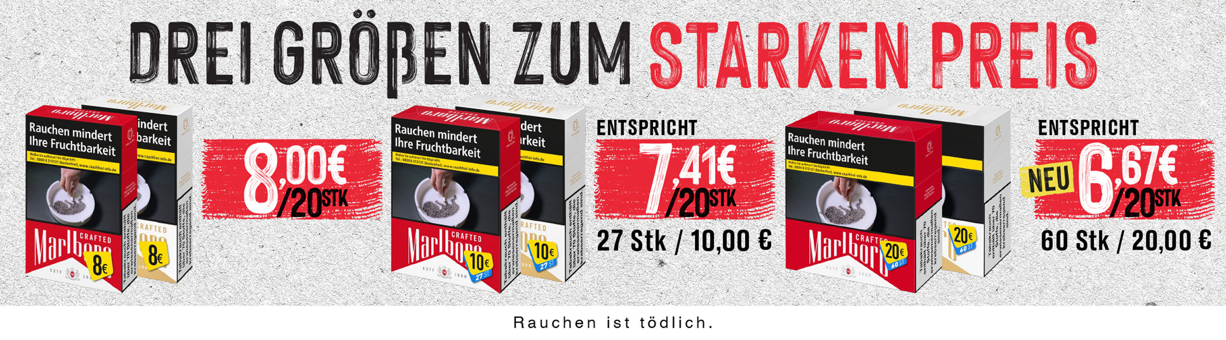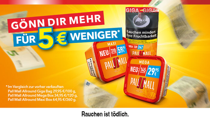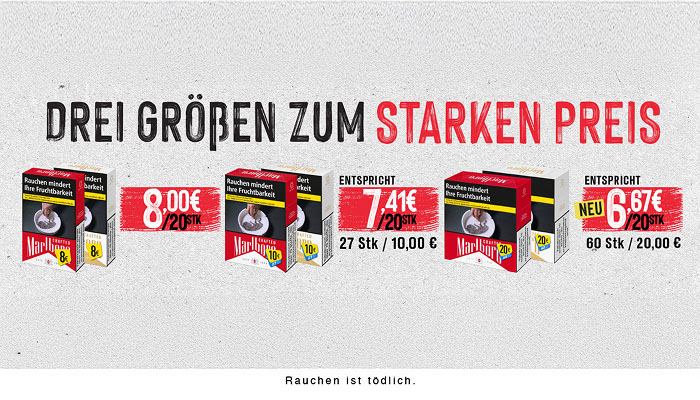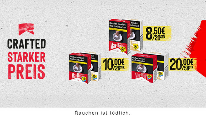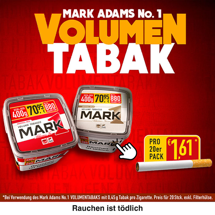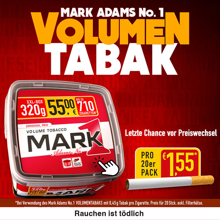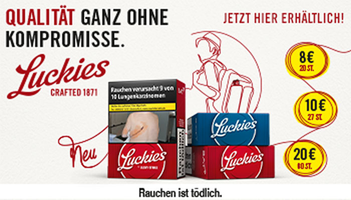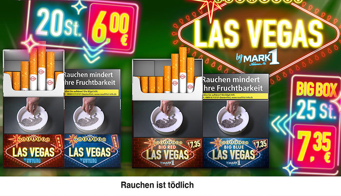Tabak Börse24 richtet sich ganz nach Ihrem individuellen Geschmack. Gehen Sie jetzt ganz bequem auf die Suche nach Ihrer Lieblingszigarette. In unserem bestens sortierten Online-Tabakshop haben Sie die Qual der Wahl. Sie werden staunen, wie viele Markenzigaretten Ihnen bei Tabak Börse24 zur Verfügung stehen. Vielleicht wollen Sie ja auch einmal eine neue Zigarettenmarke ausprobieren. Haben Sie sich dann entschieden, geht alles andere in Windeseile. Schließlich ist es uns wichtig, dass Ihr ausgewählter Artikel möglichst schnell, sicher und zu geringen Versandkosten zu Ihnen kommt. Wenn Sie Fragen haben oder eine Beratung wünschen, so rufen Sie bitte unsere Kunden-Hotline 0451-16080892 von Montag bis Donnerstag 9:00 bis 14:00 Uhr —> an. Tabak Börse24 wünscht Ihnen beim Rauchen Ihrer Zigaretten genussvolle Zeiten.