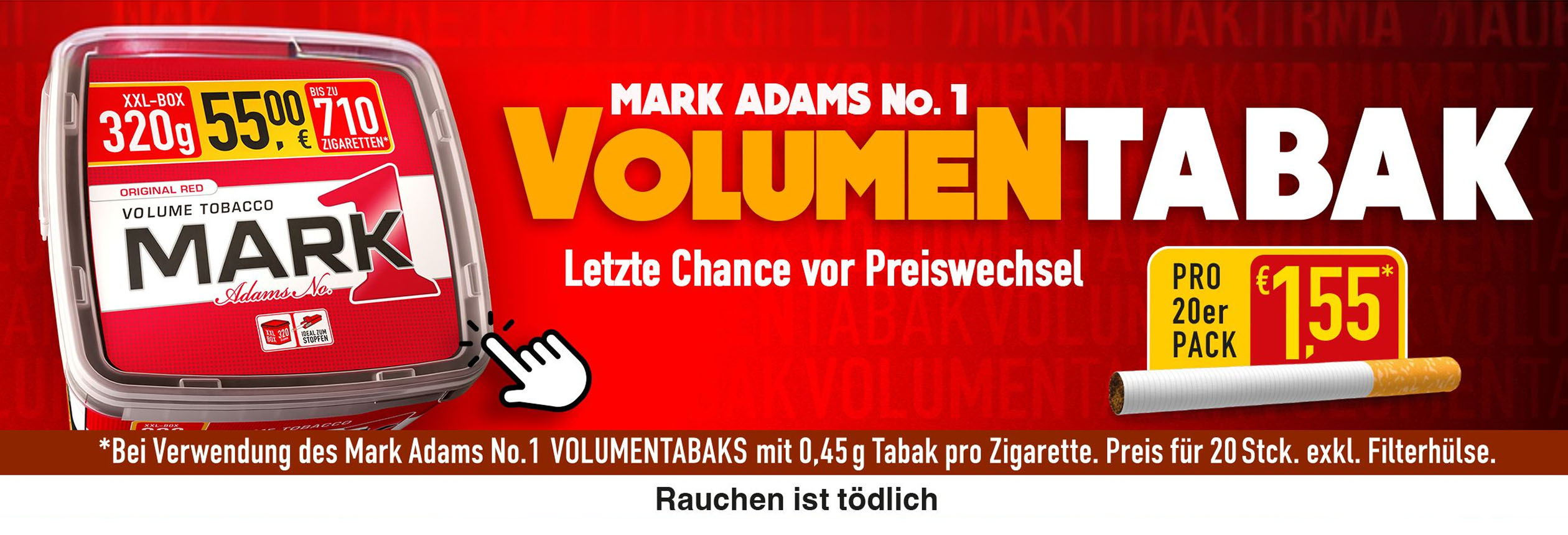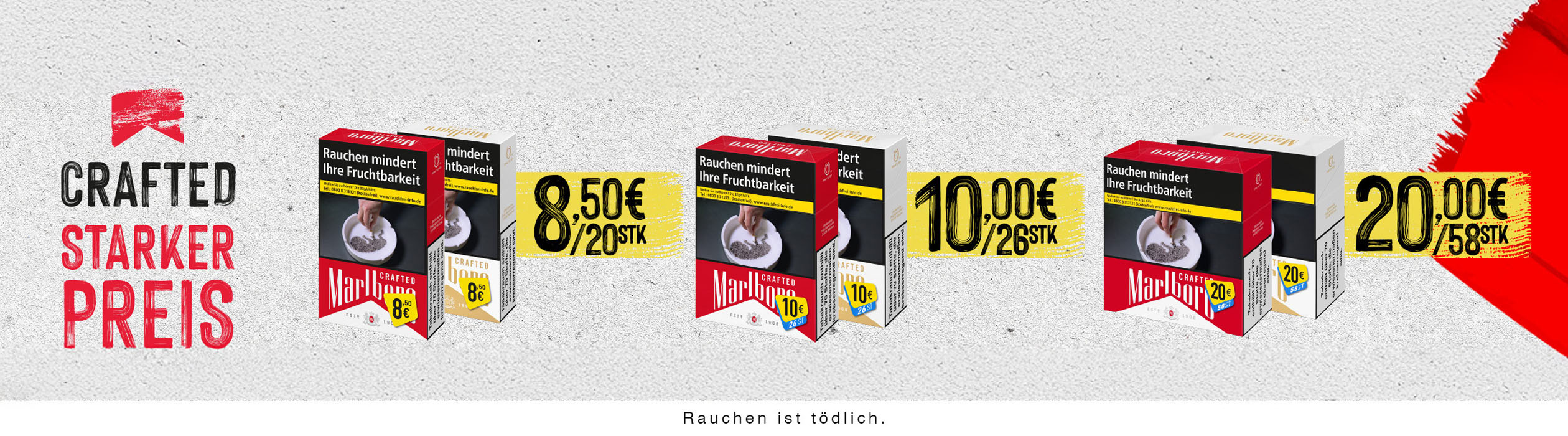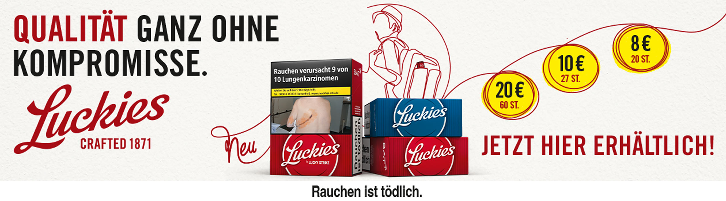 Tabak Börse24 richtet sich ganz nach Ihrem individuellen Geschmack. Gehen Sie jetzt ganz bequem auf die Suche nach Ihrer Lieblingszigarette. In unserem bestens sortierten Online-Tabakshop haben Sie die Qual der Wahl. Sie werden staunen, wie viele Markenzigaretten Ihnen bei Tabak Börse24 zur Verfügung stehen. Vielleicht wollen Sie ja auch einmal eine neue Zigarettenmarke ausprobieren. Haben Sie sich dann entschieden, geht alles andere in Windeseile. Schließlich ist es uns wichtig, dass Ihr ausgewählter Artikel möglichst schnell, sicher und zu geringen Versandkosten zu Ihnen kommt. Wenn Sie Fragen haben oder eine Beratung wünschen, so rufen Sie bitte unsere Kunden-Hotline 0451-16080892 von Montag bis Donnerstag 9:00 bis 14:00 Uhr —> an. Tabak Börse24 wünscht Ihnen beim Rauchen Ihrer Zigaretten genussvolle Zeiten.