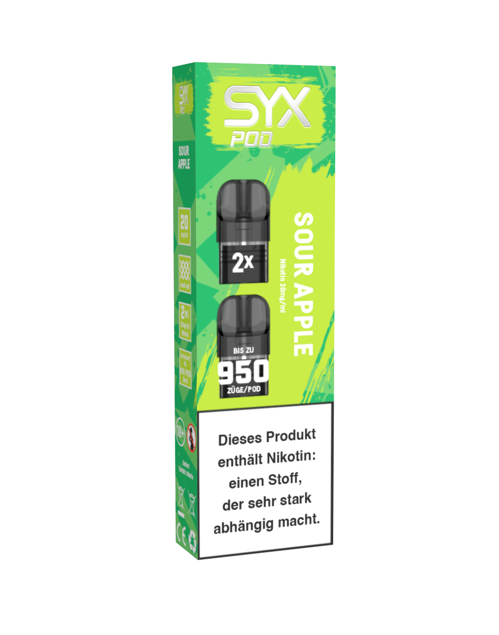 SYX Sour Apple Liquid Pod 20 mg 2er Pack enthält zwei einsatzfertige Pods zur Verwendung in dafür vorgesehenen SYX Pod-Geräten.